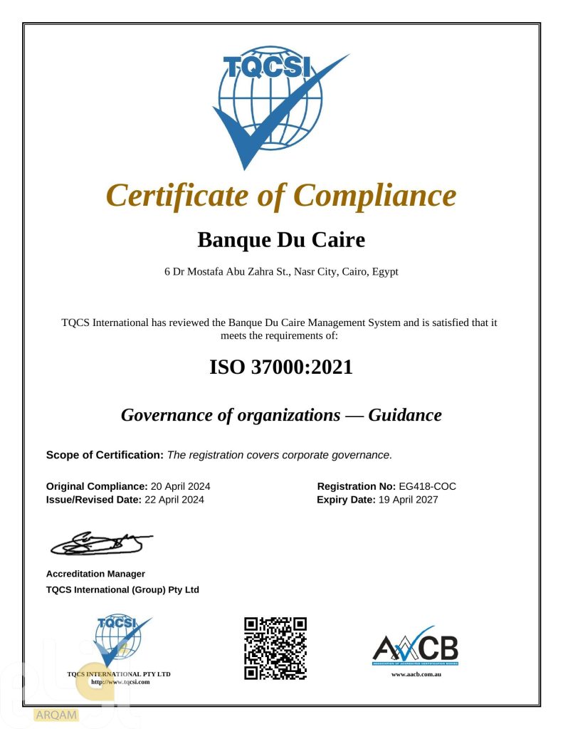 تأكيداً لريادته في تطبيق أفضل معايير الحوكمة المؤسسية، أعلن بنك القاهرة تمديد اعتماد شهادة الأيزو في مجال الحوكمة المؤسسية ISO 37000 للعام الثاني على التوالي، تتويجاً لجهوده المتواصلة في مواءمة أنظمته وإجراءاته مع المعايير الدولية المعتمدة.