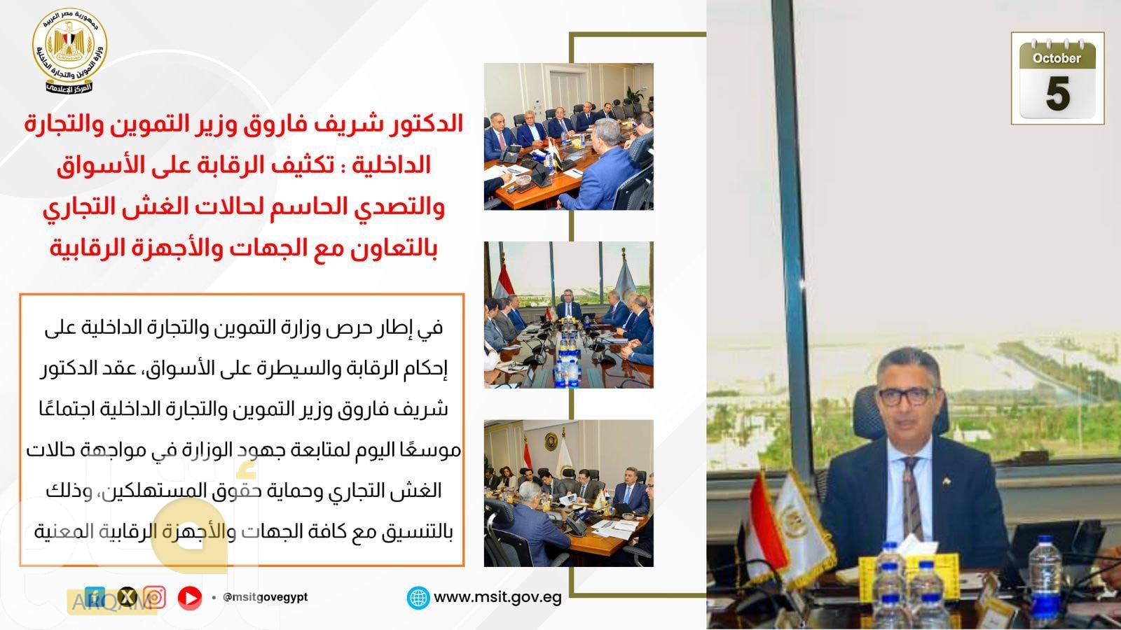 عقد الدكتور شريف فاروق وزير التموين والتجارة الداخلية اجتماعًا موسعًا مع رئيس جهاز حماية المستهلك ومدير الإدارة العامة لشرطة التموين والتجارة الداخلية وقيادات الوزارة، حيث أكد على تكثيف حملات الرقابة على الأسواق والتصدي الحاسم لممارسات الغش التجاري بالتعاون مع الأجهزة الرقابية، بما يضمن استقرار المنظومة السوقية وحماية المواطنين.