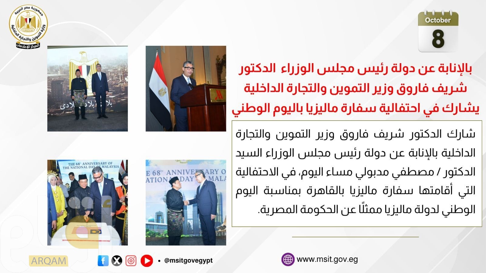واختتم الوزير نشاطه الأسبوعي بالمشاركة نيابة عن دولة رئيس مجلس الوزراء في احتفالية سفارة ماليزيا باليوم الوطني، بحضور عدد من الوزراء والسفراء وممثلي الهيئات الدولية، تأكيدًا على حرص الدولة المصرية على تعزيز علاقاتها الدبلوماسية والاقتصادية مع الدول الصديقة.