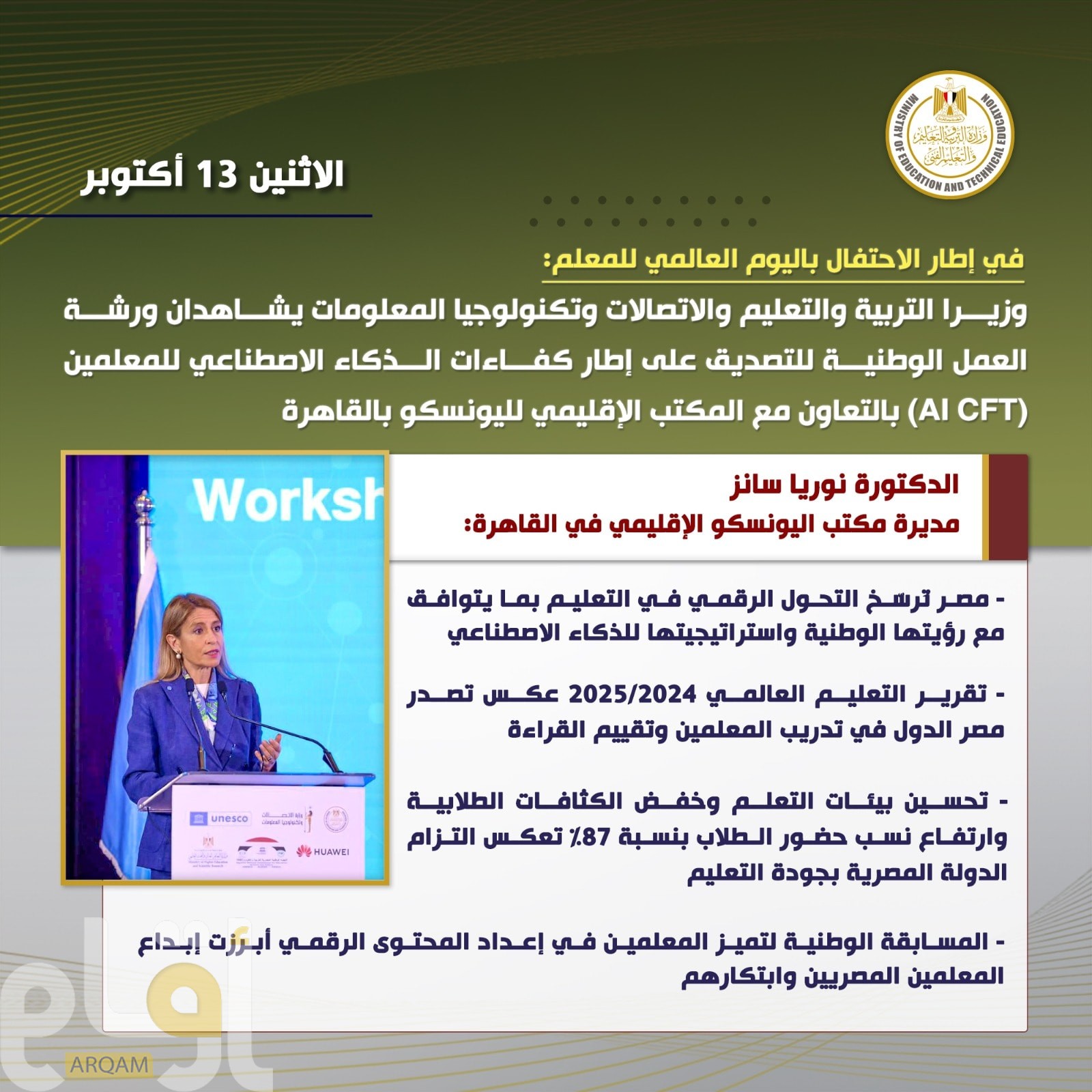 وفي السياق، أكدت سانز التوافق الكامل للإطار مع الرؤية الوطنية للتعليم والاستراتيجية الوطنية للذكاء الاصطناعي، بما يعكس طموح مصر في توظيف التكنولوجيا لتحقيق تعليم شامل وعالي الجودة للجميع.