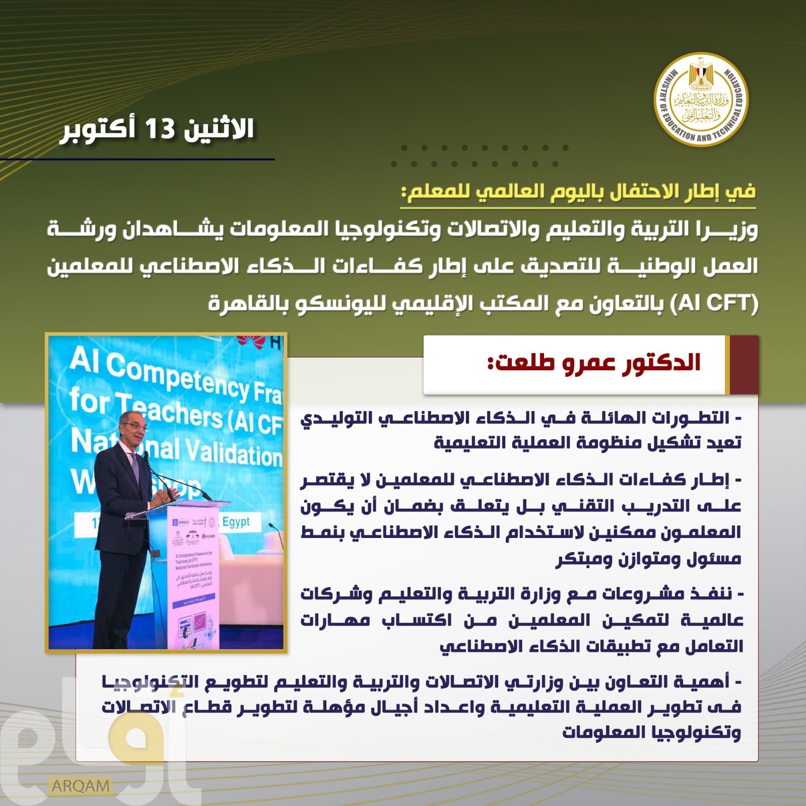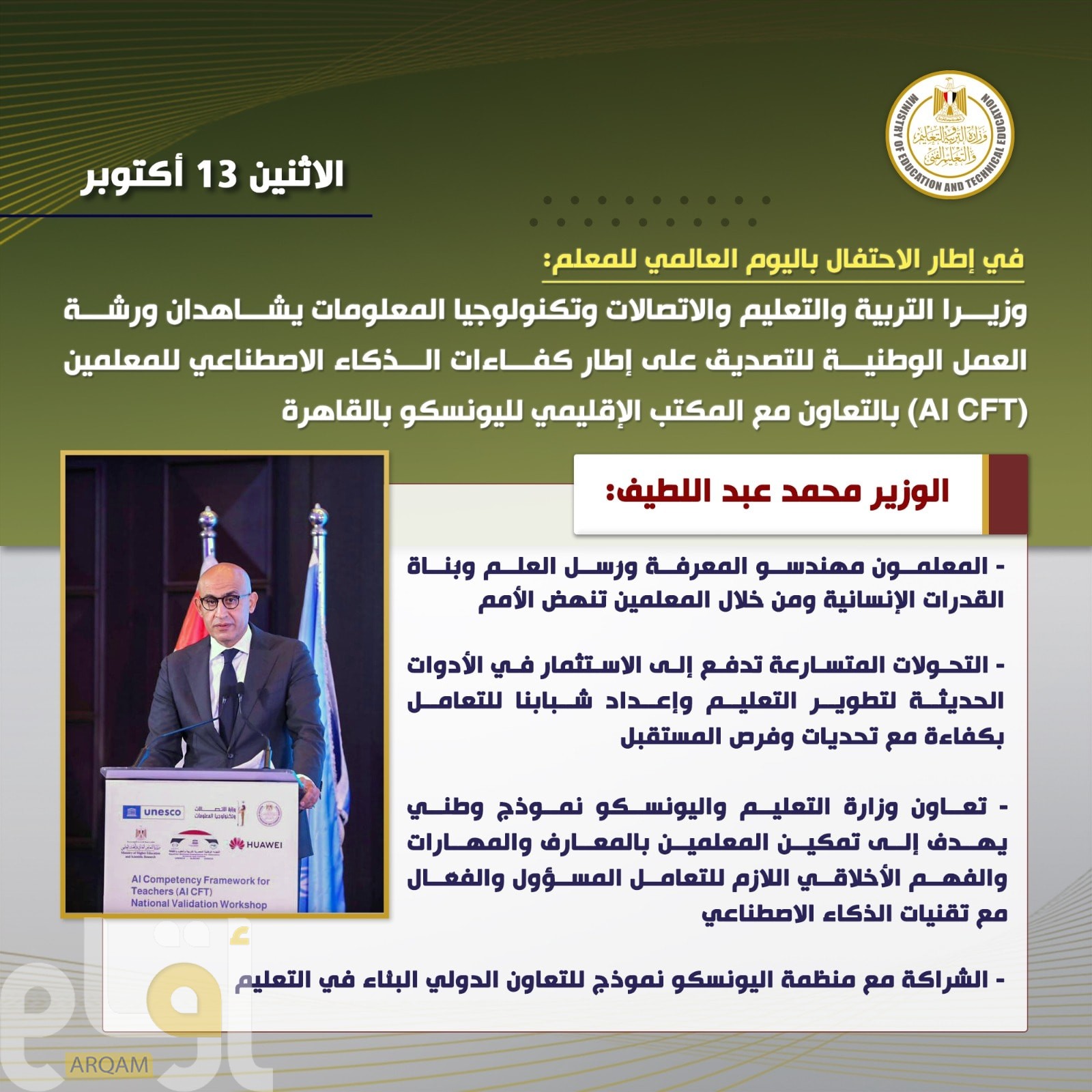 شهد السيد محمد عبد اللطيف وزير التربية والتعليم والتعليم الفنى، والدكتور عمرو طلعت وزير الاتصالات وتكنولوجيا المعلومات ورشة العمل الوطنية للتصديق على إطار كفاءات الذكاء الاصطناعي للمعلمين (AI CFT) التي تنظمها وزارة التربية والتعليم والتعليم الفني بالتعاون مع المكتب الإقليمي لليونسكو بالقاهرة؛ لإعداد المعلمين وتطويرهم ودعم استخدام أدوات الذكاء الاصطناعي في التعليم.