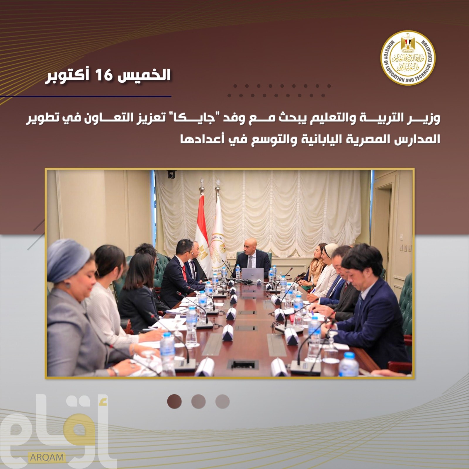 عقد السيد محمد عبد اللطيف وزير التربية والتعليم والتعليم الفني، اجتماعًا مع وفد هيئة التعاون الدولي اليابانية (جايكا)، لبحث سبل تعزيز التعاون المشترك بين الجانبين في تطوير نظم التعليم بالمدارس المصرية اليابانية.