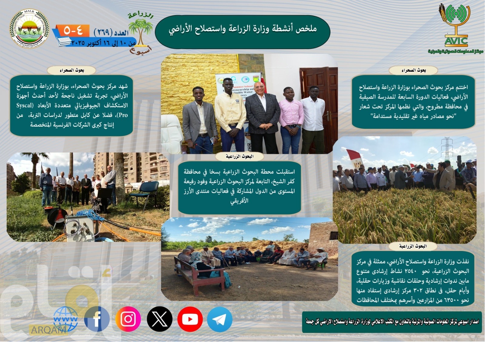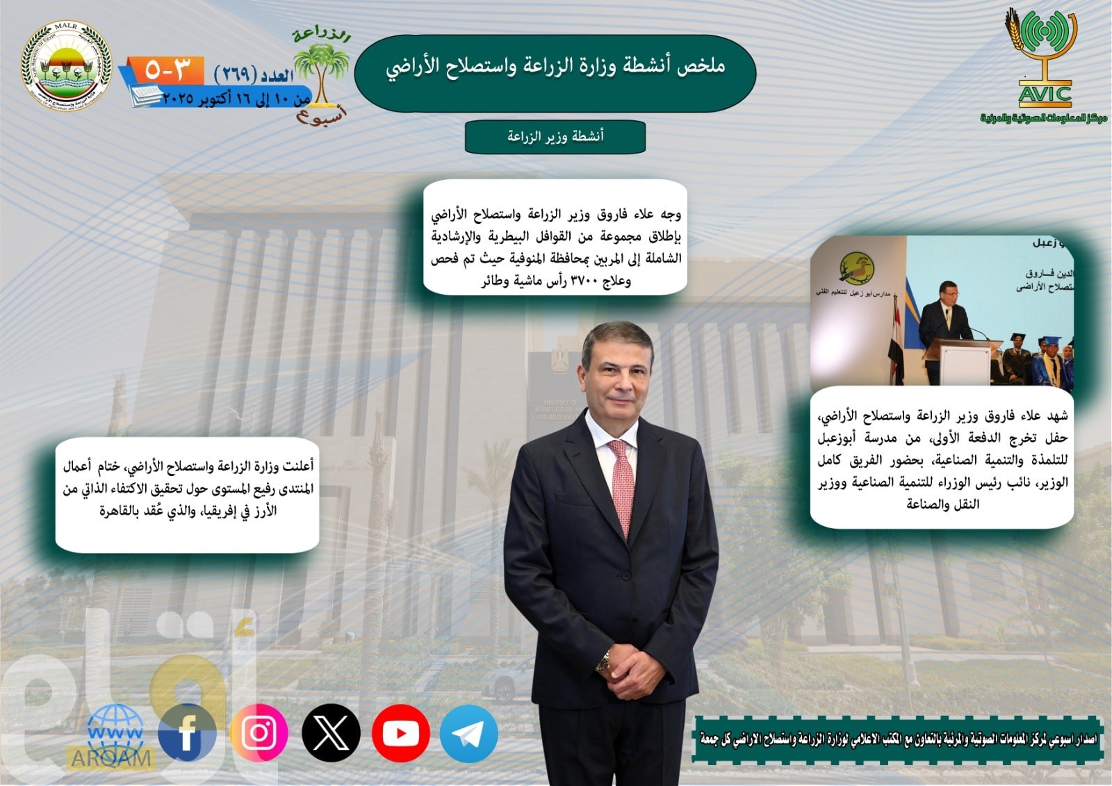 أصدر مركز المعلومات الصوتية والمرئية بوزارة الزراعة واستصلاح الأراضي، “الانفوجراف الاسبوعي” في نسخته رقم 269 حول الحصاد الاسبوعي لأهم أنشطة الوزارة، خلال الاسبوع الماضي في الفترة من 10 وحتى 16 أكتوبر الجاري، كما أصدر المركز ايضا ملخصا بالفيديو، حول انشطة الوزارة خلال نفس الفترة.