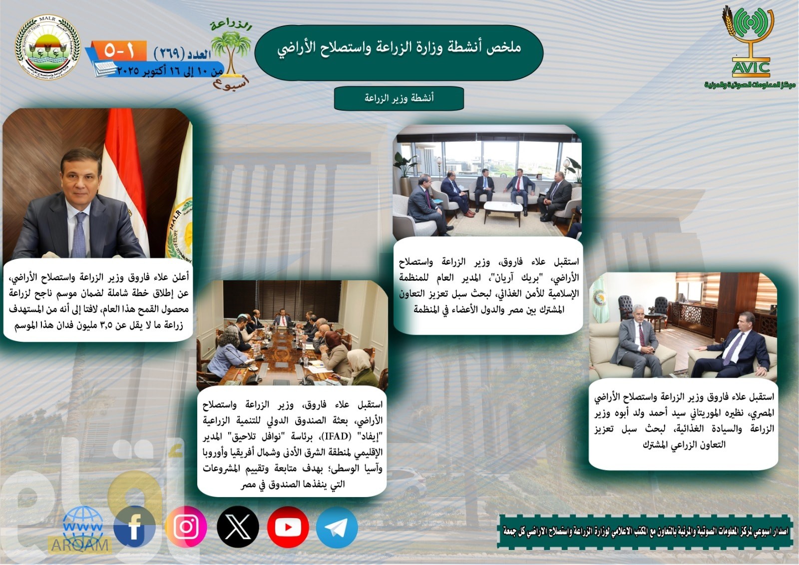 وخلال هذا الأسبوع استقبل علاء فاروق وزير الزراعة واستصلاح الأراضي المصري، نظيره الموريتاني سيد أحمد ولد أبوه وزير الزراعة والسيادة الغذائية، لبحث سبل تعزيز التعاون الزراعي المشترك، كما استقبل فاروق، “بريك آريان”، المدير العام للمنظمة الإسلامية للأمن الغذائي، لبحث سبل تعزيز التعاون المشترك بين مصر والدول الأعضاء في المنظمة، كذلك استقبل أيضا بعثة الصندوق الدولي للتنمية الزراعية “إيفاد” (IFAD)،  بهدف متابعة وتقييم المشروعات التي ينفذها الصندوق في مصر.