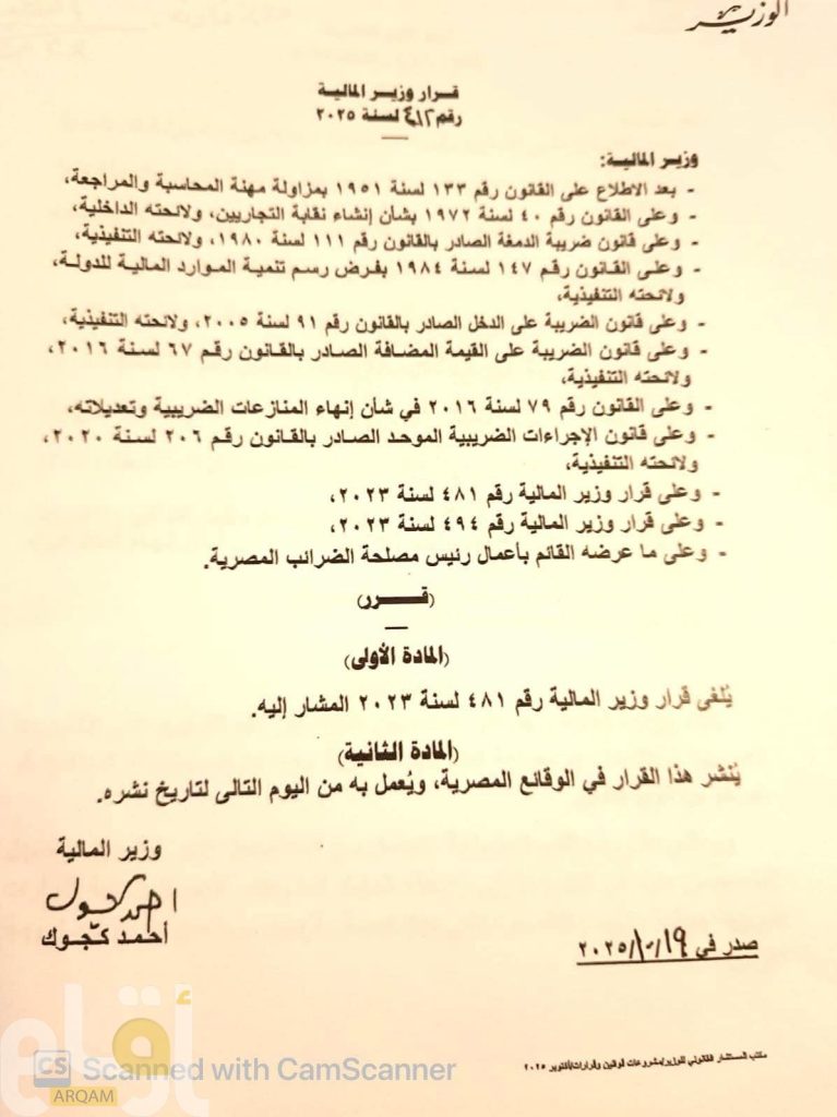 كشف الدكتور جون سعد الخبير الضريبى عن صدور قرار من وزارة المالية يتضمن إلغاء قرار آخر يحمل رقم 481 لسنة 2023 بشأن إنشاء سجل لقيد المحاسبين للتعامل مع مصلحة الضرائب.