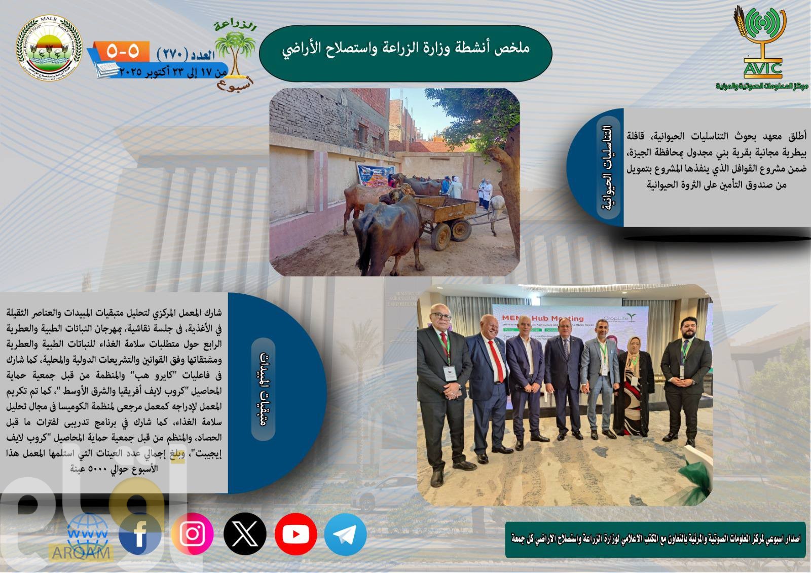 كما كثف مركز الزراعات التعاقدية جهوده، بعقد سلسلة من الورش والندوات التوعوية والزيارات الميدانية المكثفة التي شملت مؤخرا محافظات: الدقهلية، سوهاج، وأسيوط، وذلك في إطار تفعيل منظومة الزراعة التعاقدية للمحاصيل الاستراتيجية، كذلك أطلق معهد بحوث التناسليات الحيوانية، قافلة بيطرية مجانية بقرية بني مجدول بمحافظة الجيزة، ضمن مشروع القوافل الذي ينفذها المشروع بتمويل من صندوق التأمين على الثروة الحيوانية.
