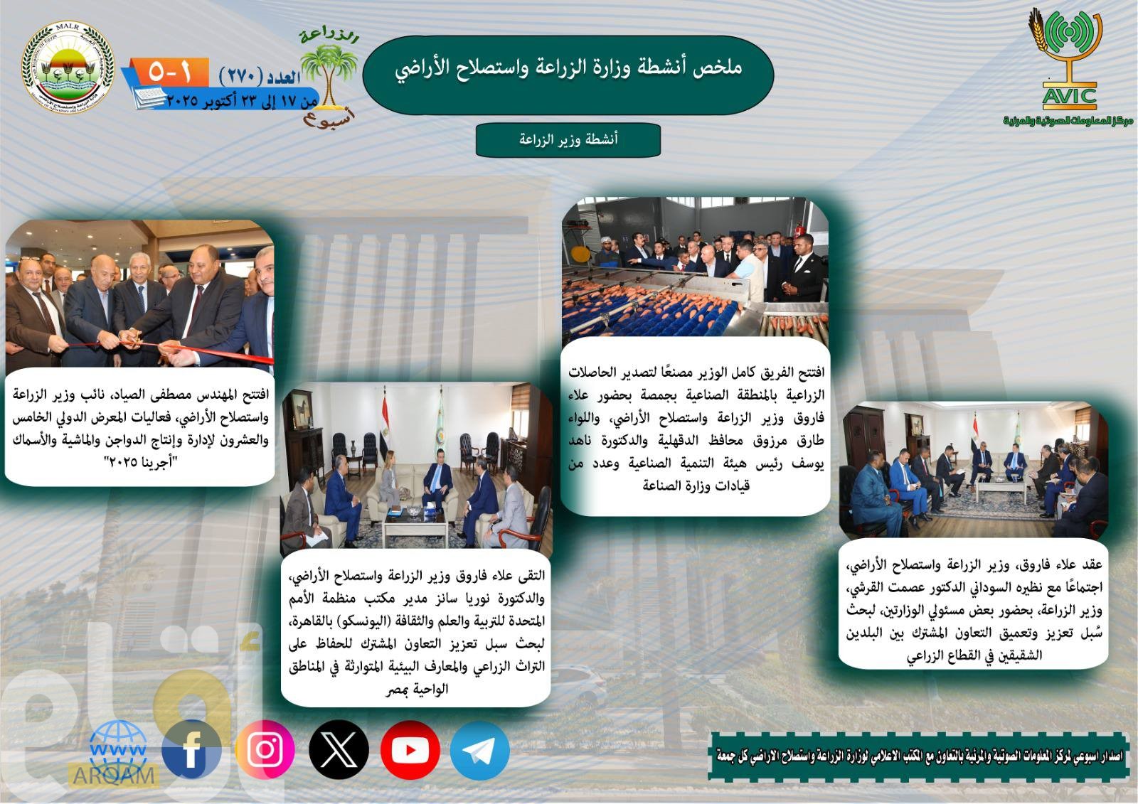 وسلط الانفوجراف الضوء على افتتاح الفريق كامل الوزير نائب رئيس الوزراء مصنعًا لتصدير الحاصلات الزراعية بالمنطقة الصناعية بجمصة بحضور علاء فاروق وزير الزراعة واستصلاح الأراضي، واللواء طارق مرزوق محافظ الدقهلية والدكتورة ناهد يوسف رئيس هيئة التنمية الصناعية، بينما عقد علاء فاروق، وزير الزراعة واستصلاح الأراضي، اجتماعًا مع نظيره السوداني الدكتور عصمت القرشي، وزير الزراعة، بحضور بعض مسئولي الوزارتين، لبحث سُبل تعزيز وتعميق التعاون المشترك بين البلدين الشقيقين في القطاع الزراعي