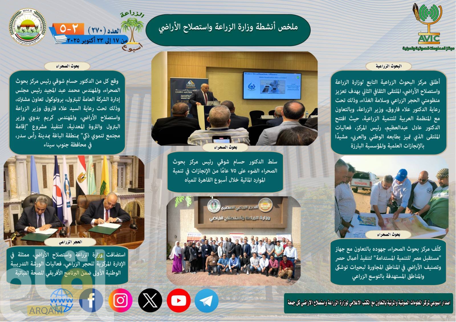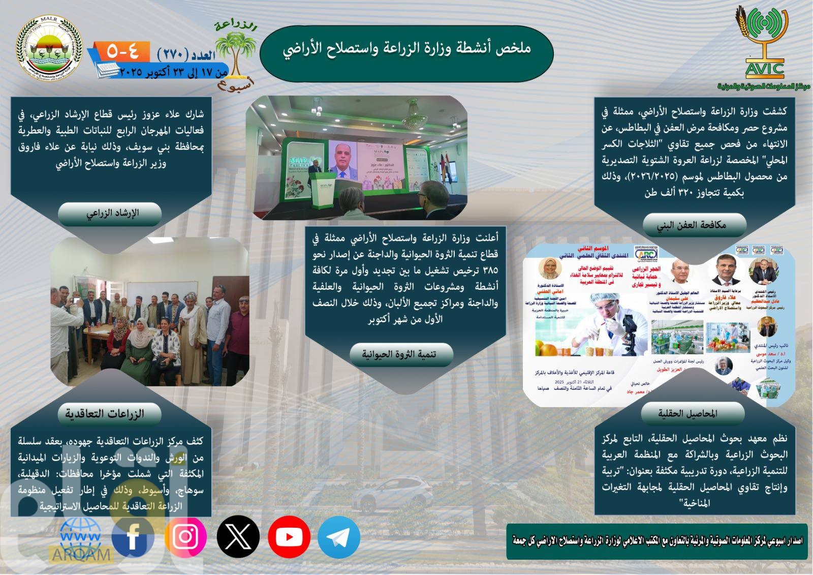 أصدر مركز المعلومات الصوتية والمرئية بوزارة الزراعة واستصلاح الأراضي، “الانفوجراف الاسبوعي” في نسخته رقم 270 حول الحصاد الاسبوعي لأهم أنشطة الوزارة، خلال الاسبوع الماضي في الفترة من 17 وحتى 23 أكتوبر الجاري، كما أصدر المركز ايضا ملخصا بالفيديو، حول انشطة الوزارة خلال نفس الفترة.