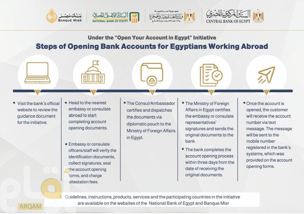 Under this initiative, Egyptians working abroad can open a bank account with NBE or Banque Misr by visiting the premises of the nearest Egyptian diplomatic mission or consulate to complete and sign the account opening form. The embassies or consulates will verify these forms, which will then be re-verified at the Ministry of Foreign Affairs in Egypt before being sent to Banque Misr and NBE for account processing.