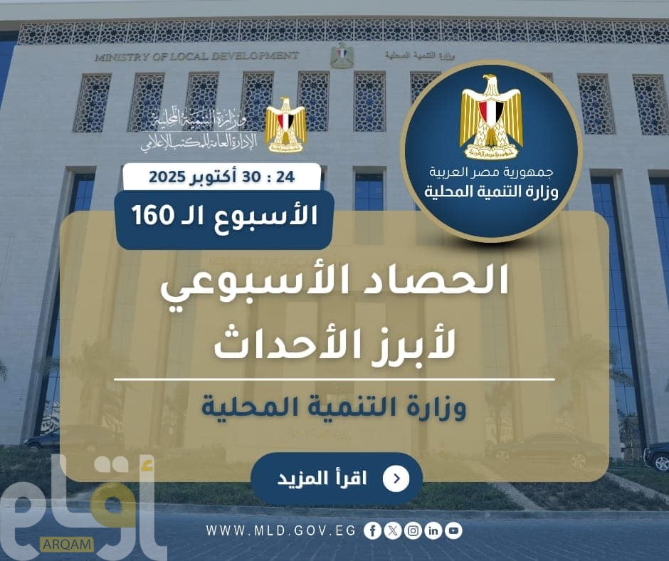 أصدر المركز الإعلامي لوزارة التنمية المحلية “الانفوجراف الأسبوعي” في نسخته الـ 160 حول أبرز أنشطة وفعاليات الوزارة بقيادة الدكتورة منال عوض وزيرة التنمية المحلية، حيث تضمن مجموعة من الفعاليات والاجتماعات ومتابعة المشروعات التنموية المهمة خلال الفترة (24 : 30 أكتوبر 2025).