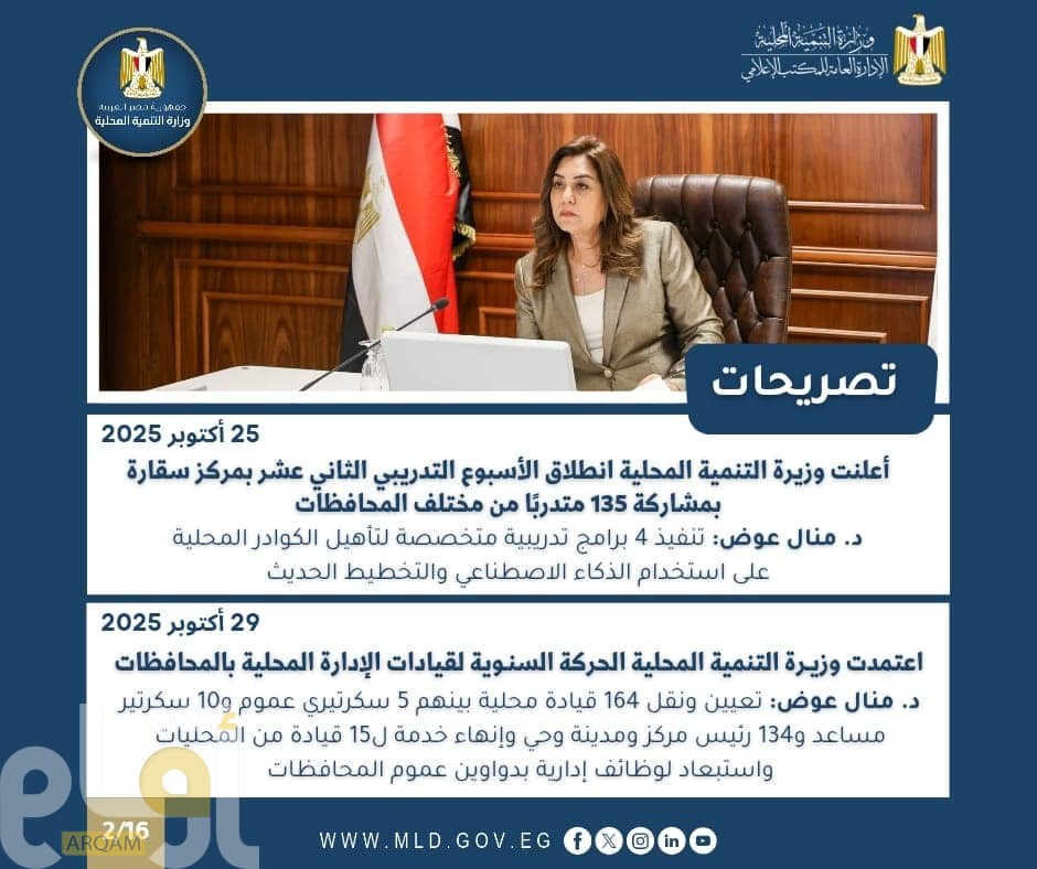 أعلنت الدكتورة منال عوض، وزيرة التنمية المحلية عن إنطلاق فعاليات الأسبوع التدريبي الثاني عشر من الخطة التدريبية لمركز التنمية المحلية بسقارة لعام 2025 / 2026، والذي يُعقد خلال الفترة من 26 إلى 29 أكتوبر 2025، ويتضمن تنفيذ 4 برامج تدريبية متخصصة بمشاركة 135 متدربًا من مختلف المحافظات.