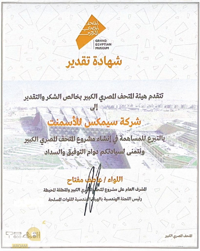 مع افتتاح المتحف المصري الكبير أبوابه أمام العالم، تفخر سيمكس مصر باستعراض دورها كأحد أوائل الداعمين لهذا المشروع الثقافي الذي يُعد من بين أهم المشاريع في القرن. وتُظهر مشاركة سيمكس في هذا الصرح الوطني التزامها الراسخ تجاه مصر وتراثها ومستقبلها حيث أدركت الشركة الأهمية القصوى للمتحف المصري الكبير منذ المراحل المبكرة لإنشائه.