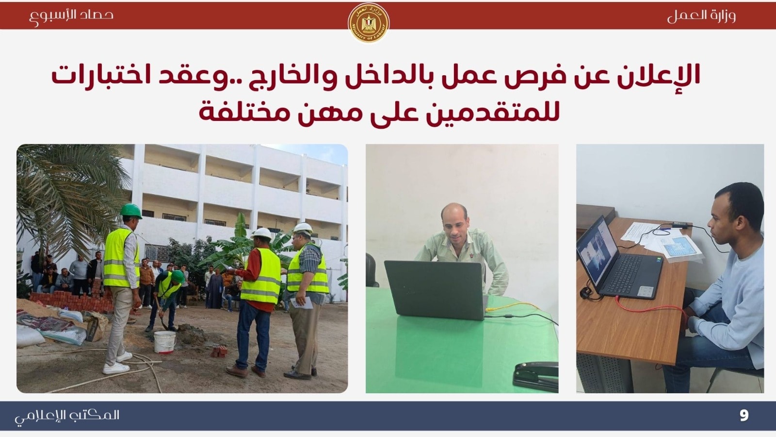 ..بهذه الجهود المتكاملة، واصلت وزارة العمل خلال الأسبوع تنفيذ رؤية الدولة لبناء سوق عمل منظم، آمن، وعادل، قائم على الشراكة بين الحكومة والقطاع الخاص والمجتمع المدني، بما يعزز التنمية المستدامة وينشر ثقافة السلامة والصحة المهنية في مواقع العمل ،ويصون كرامة الإنسان العامل في الجمهورية الجديدة.