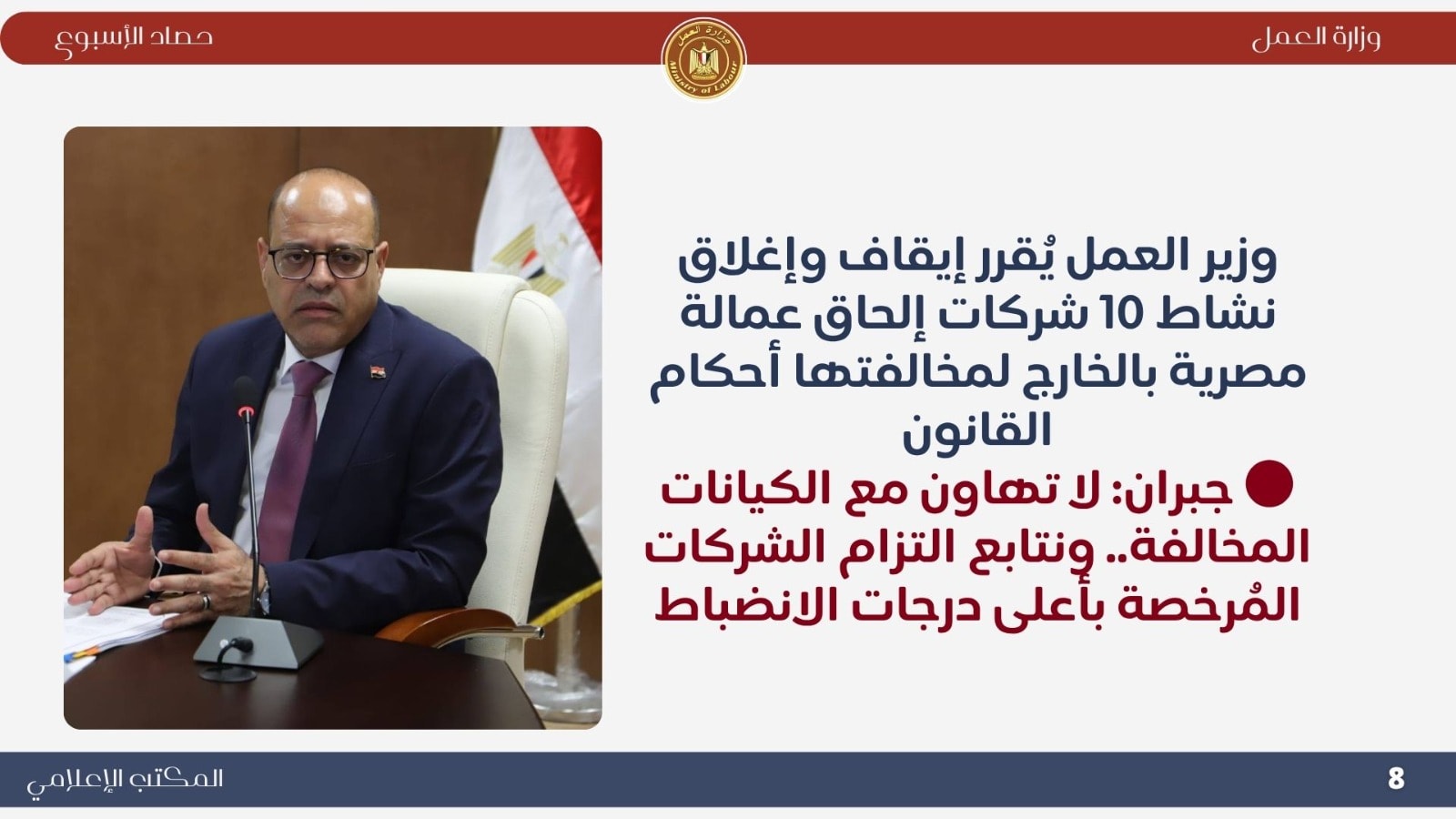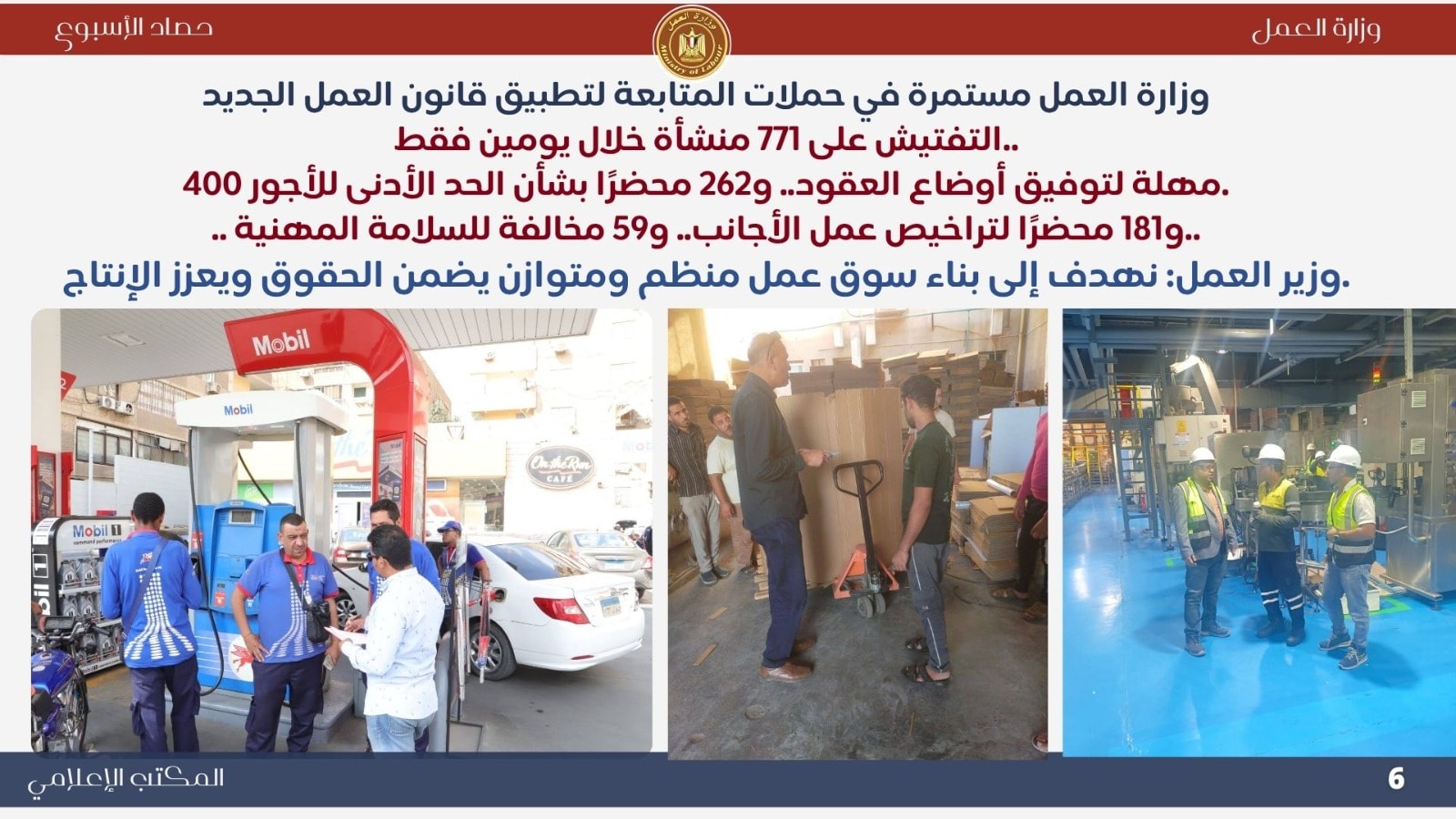 ..بهذه الجهود المتكاملة، واصلت وزارة العمل خلال الأسبوع تنفيذ رؤية الدولة لبناء سوق عمل منظم، آمن، وعادل، قائم على الشراكة بين الحكومة والقطاع الخاص والمجتمع المدني، بما يعزز التنمية المستدامة وينشر ثقافة السلامة والصحة المهنية في مواقع العمل ،ويصون كرامة الإنسان العامل في الجمهورية الجديدة.