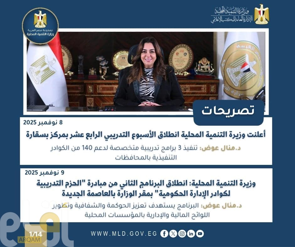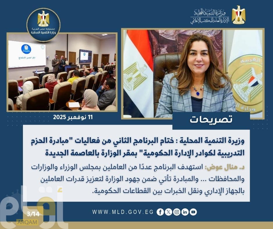 كما أعلنت الدكتورة منال عوض وزيرة التنمية المحلية والقائم بأعمال وزير البيئة، عن انطلاق البرنامج التدريبي الثاني من مبادرة “الحزم التدريبية لكوادر الإدارة الحكومية”، والذي يعقد خلال الفترة من 9 إلى 11 نوفمبر 2025 بمقر الوزارة بالعاصمة الجديدة، بحضور عدد من قيادات وزارة التنمية المحلية ومركز التنمية المحلية للتدريب بسقارة وذلك تحت عنوان “آليات الحوكمة وأفضل الممارسات في إعداد اللوائح المالية والإدارية” .