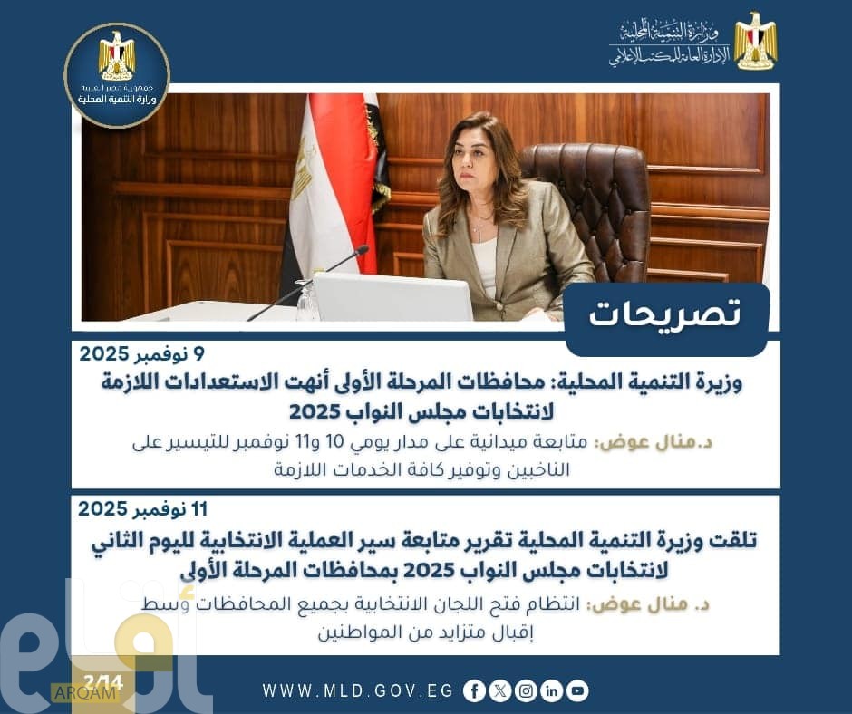 أعلنت الدكتورة منال عوض وزيرة التنمية المحلية والقائم بأعمال وزير البيئة، عن إنتهاء محافظات المرحلة الأولى لانتخابات مجلس النواب 2025 لاستعداداتها والتي تستمر على مدار يومي الإثنين والثلاثاء الموافقين 10 و 11 نوفمبر الجاري حيث تم اتخاذ كافة الإجراءات اللوجستية والتنظيمية اللازمة لتيسير العملية الانتخابية ، تنفيذًا لتوجيهات القيادة السياسية وتكليفات مجلس الوزراء، وبما يضمن خروج الانتخابات في أجواء منظمة وآمنة تليق بالدولة المصرية.