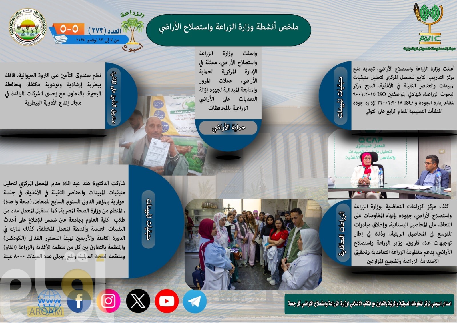 وأطلقت وزارة الزراعة واستصلاح الأراضي، خلال هذا الاسبوع، أولى “قوافل التنمية الزراعية الشاملة” من مركز العدوة محافظة المنيا، تحت رعاية علاء فاروق وزير الزراعة واستصلاح الأراضي، واللواء عماد كدواني، محافظ المنيا، تحت شعار “معاك في الغيط.. معًا نحصد الخير، كما نظمت الوزارة، أكثر من 2300 نشاط إرشادي متنوع لدعم أكثر من 61 ألف مزارع خلال اكتوبر ضمن مبادرة “البحوث الزراعية” لتفعيل المراكز الإرشادية، كما شهدت الوزارة، اجتماعا تنسيقيا موسعا، تنفيذا لتكليفات علاء فاروق وزير الزراعة واستصلاح الأراضي، بهدف توحيد الجهود الإرشادية بكافة الجهات المعنية التابعة للوزارة