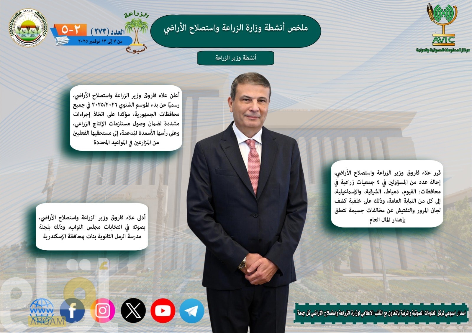 وقرر وزير الزراعة واستصلاح الأراضي، إحالة عدد من المسؤولين في 4 جمعيات زراعية في محافظات: الفيوم، دمياط، الشرقية، والإسماعيلية، إلى كل من النيابة العامة، وذلك على خلفية كشف لجان المرور والتفتيش عن مخالفات جسيمة تتعلق بإهدار المال العام، كما أعلن رسميًا عن بدء الموسم الشتوي 2026/2025 في جميع محافظات الجمهورية، مؤكدا على اتخاذ إجراءات مشددة لضمان وصول مستلزمات الإنتاج الزراعي، وعلى رأسها الأسمدة المدعمة، إلى مستحقيها الفعليين من المزارعين في المواعيد المحددة