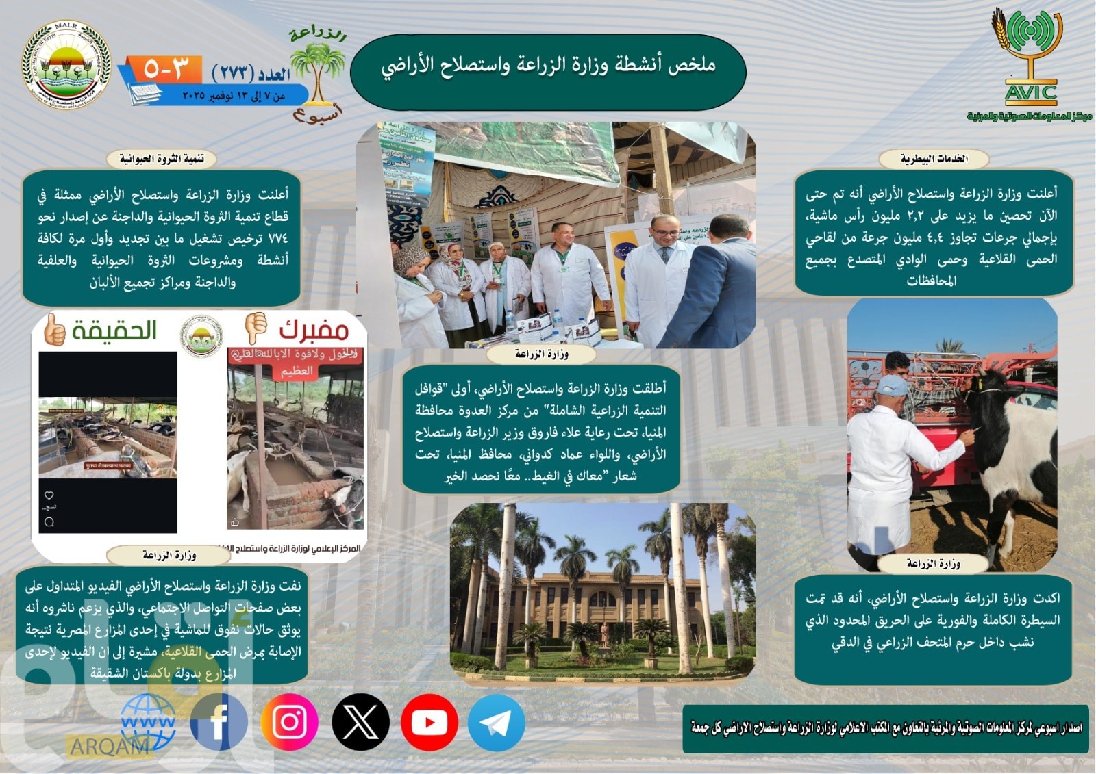 يذكر ان مركز المعلومات الصوتية والمرئية، والمكتب الاعلامي للوزارة، يصدران الجمعة من كل اسبوع، انفوجرافا وفيديو باسم: الزراعة في اسبوع، لالقاء الضوء على ملخص ما تم من انشطة وجهود، بكافة القطاعات والهيئات، التابعة للوزارة، فضلا عن انفوجراف وفيديو كل ثلاثاء باسم: الزراعة في كل مصر، حول انشطة وجهود القطاع الزراعي، بالمحافظات المختلفة.