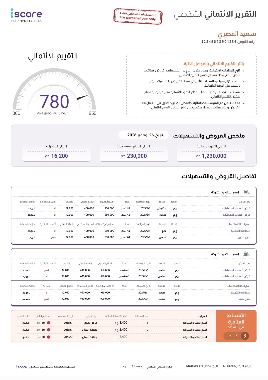 وأوضحت iscore أن الخدمة الجديدة تتيح للمستخدمين الحصول على تقرير ائتماني إلكتروني شامل، يتضمن التسهيلات الائتمانية، والالتزامات القائمة، والدرجة الائتمانية، ومؤشرات الجدارة الائتمانية، إلى جانب إمكانية مراجعة البيانات ومتابعة الأداء الائتماني بدقة وسهولة عبر المنصة، دون الحاجة إلى زيارة أي فرع أو جهة تمويلية.