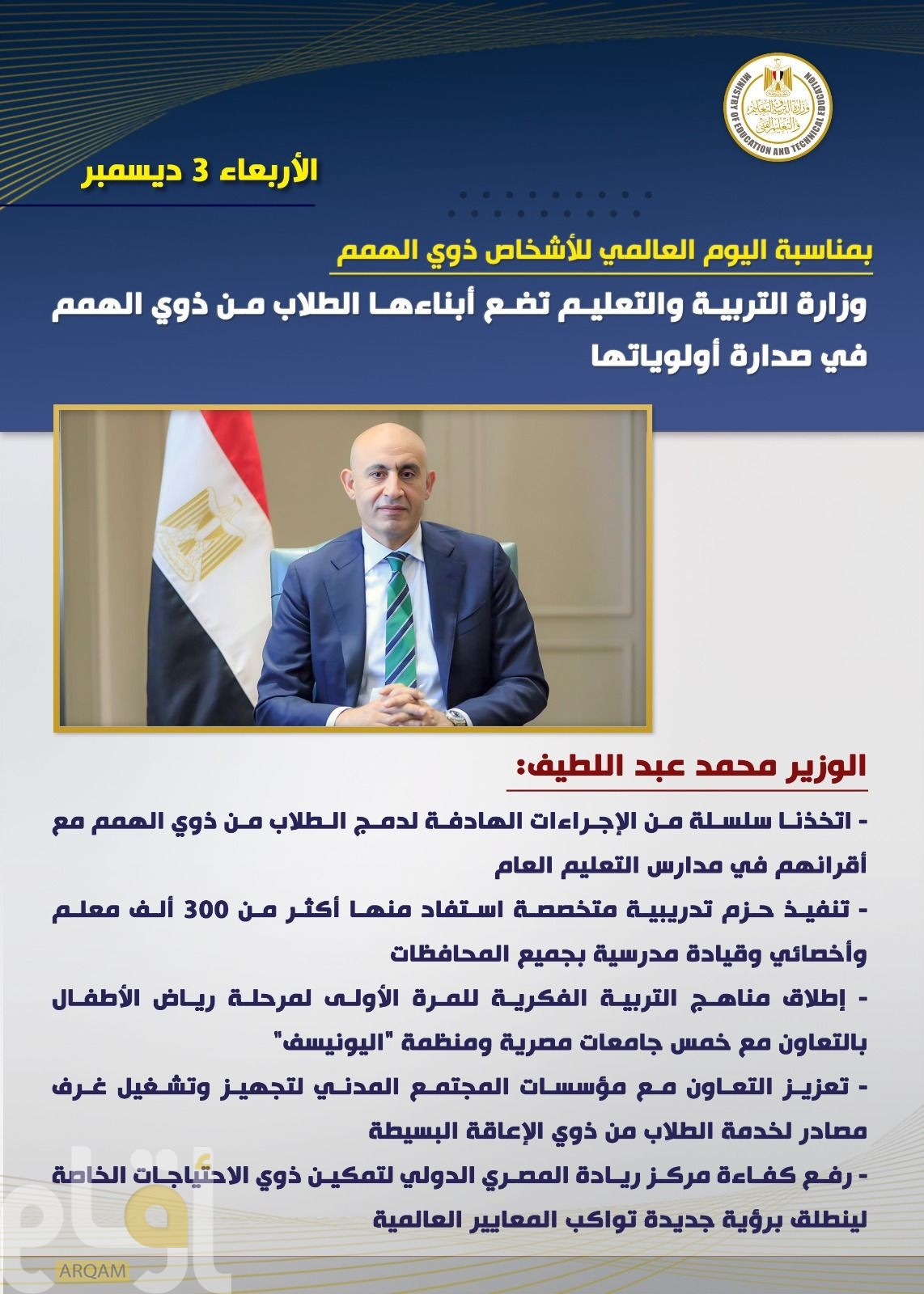بمناسبة اليوم العالمي للأشخاص ذوي الهمم، تؤكد وزارة التربية والتعليم والتعليم الفني حرصها الدائم على وضع أبنائها من الطلاب ذوي الهمم في صدارة أولوياتها، وبذل كل الجهود لضمان تعليم عالي الجودة لهم دون أي تمييز.