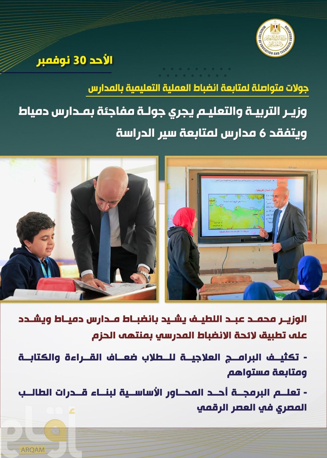 في إطار جولاته المتواصلة لمتابعة انضباط العملية التعليمية بمختلف المدارس على مستوى الجمهورية، أجرى السيد محمد عبد اللطيف وزير التربية والتعليم والتعليم الفني، زيارة مفاجئة، لعدد من مدارس محافظة دمياط، وذلك لمتابعة سير العملية التعليمية والانضباط داخل المدارس والاطمئنان على انتظام الدراسة بمختلف المراحل التعليمية.