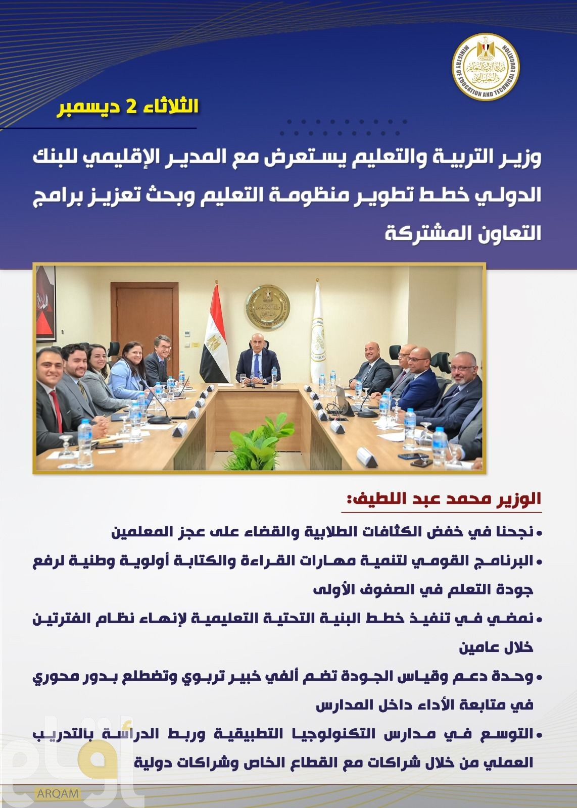 وأكد المدير الإقليمي للبنك الدولي أن ما تم استعراضه من تقدم ملموس في المنظومة التعليمية يُعد تطوراً مهماً، مؤكدا استعداد البنك لمواصلة دعم خطط تطوير المنظومة التعليمية في مصر.